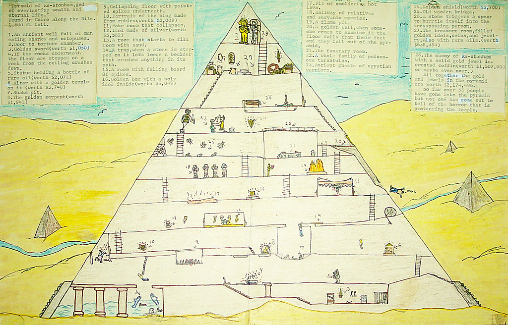 I created this little illustration of doom back in Grade School for some project or another. You can tell that I am beginning to get a bit twisted and a little geeky-dungeons-and-dragony-kinda-creative with the whole set-up of this. I spent a lot of time devising horrible little devices of death (Grimtooth - eat your heart out) for any who dared to intrude upon these hallowed grounds of Ra-atomham.
