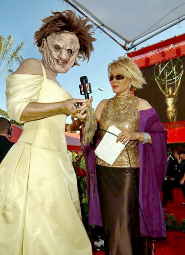 JOAN RIVERS: AND... OH MY GOD!!! Who's coming down the carpet now? Why, it's our favorite chainsaw wielding mentally disturbed cannibal Leatherface. OH... OH... you know, from those Texas Chainsaw murders.